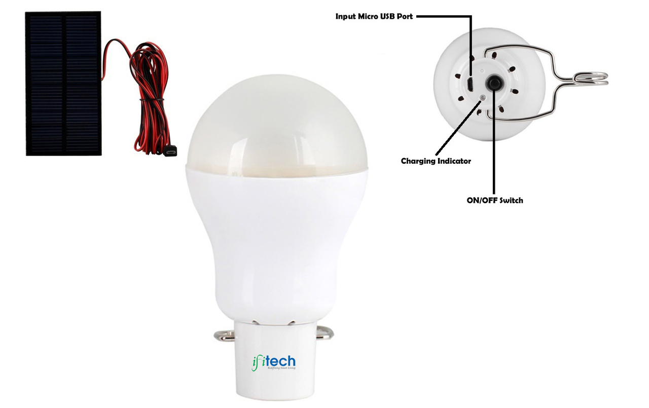 ηλιακό πακέτο φωτισμού με panel και μπαταρία με θύρα usb για φόρτιση της λάμπας καθώς και κινητού με θύρα micro usb.